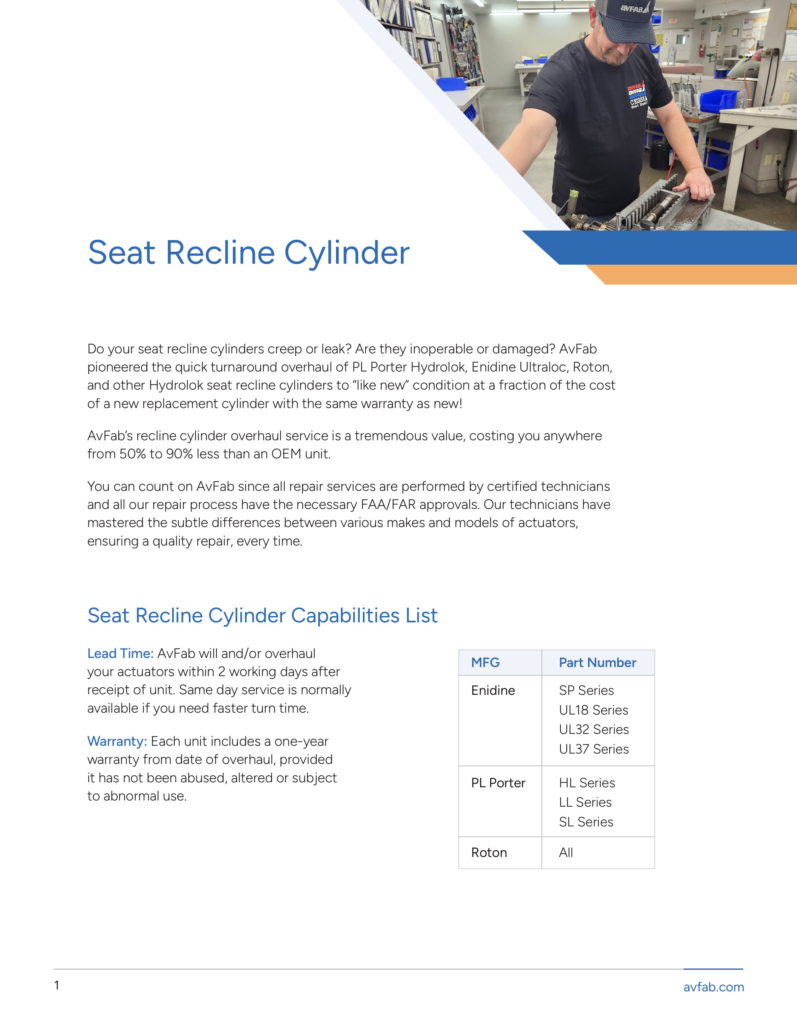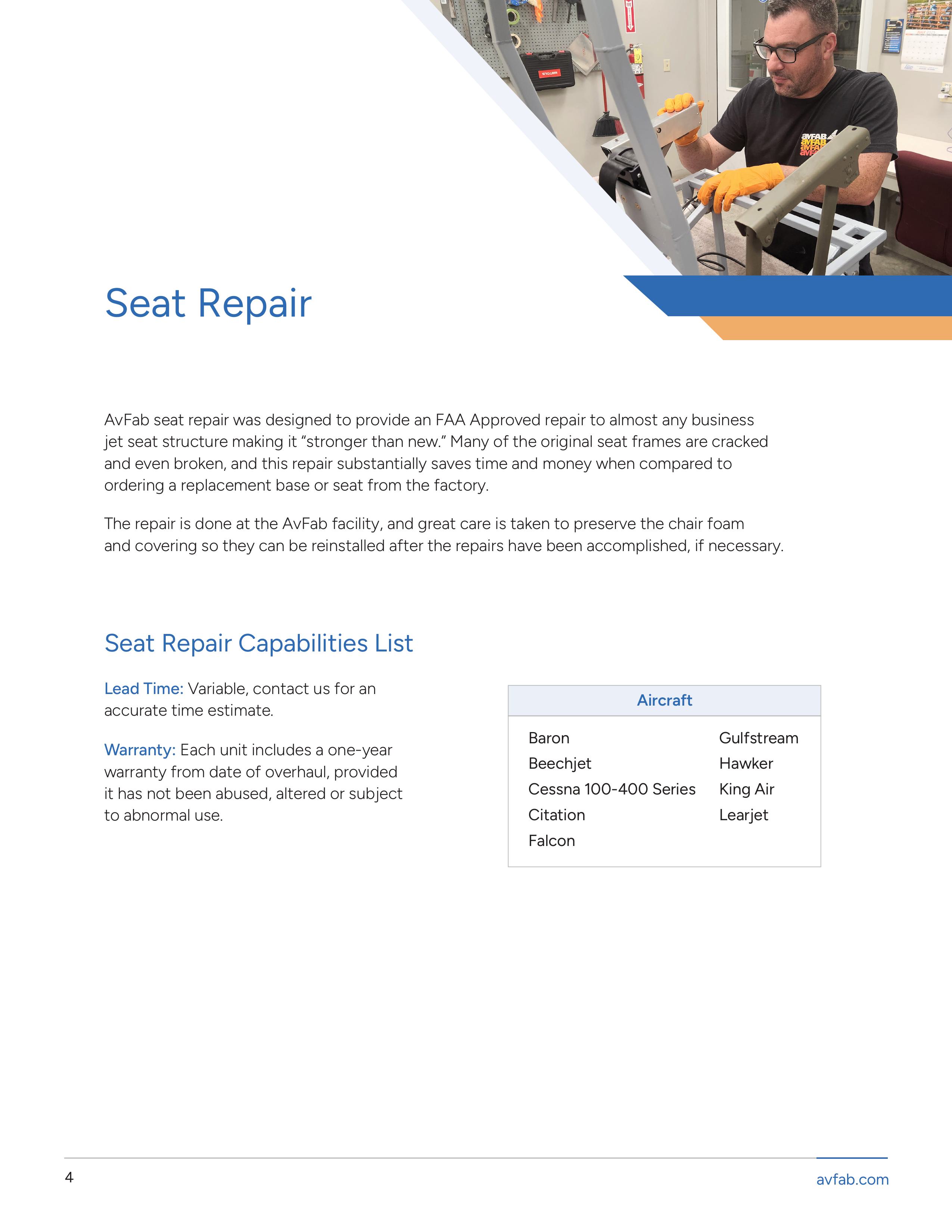 AvFab is a FAA CRS (Certified Repair Station) facility. Our CRS Repair Services Catalog is available here for preview and download as a .pdf file. The following pages reflect only a sample of the many repair services offered by AvFab. Please contact us at sales@avfab.com for a free quote and current lead time estimate for your particular aircraft service needs.